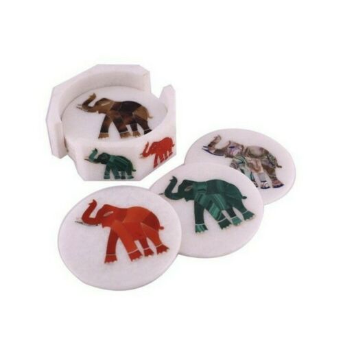 Elegant Handmade White Marble Coaster Set Semi Precious Stones Art